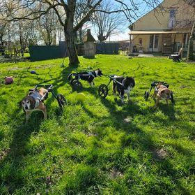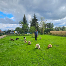 Wenn wir mit den Hunden im Rollwagen hinausgehen, können sie sich auf einem sehr großen, ebenfalls eingezäunten Gelände bewegen. Dort können sie schnüffeln, graben, beobachten und miteinander spielen – natürlich immer unter Aufsicht. Wenn nämlich ein Hund im Rollstuhl umkippt, kann er nicht allein wieder aufstehen und braucht eine kleine helfende Hand.